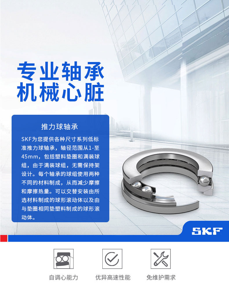 SKF的單向推力球軸承,可以承受單方向的軸向負荷,并能作單方向的軸向定位,但絕不能承受任何徑向負荷。